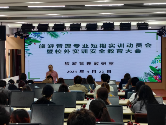 按照旅游管理专业的人才培养方案要求和教学计划的安排,为更好的做好旅游管理专业校外短期实训的相关工作,2024年4月22日上午9:00,旅游管理教研室组织本专业师生近120余人参加了校外短期实训动员会暨安全教育大会。
