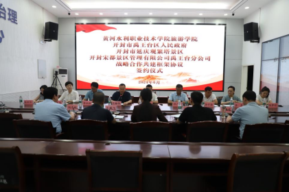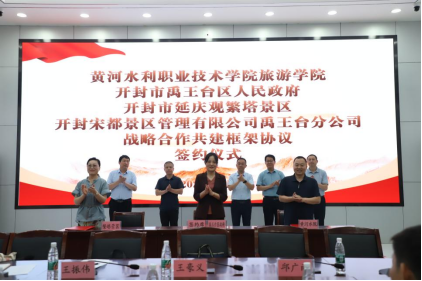 6月19日,旅游学院与开封市禹王台区人民政府、延庆观樊塔景区、宋都景区管理有限公司禹王台分公司战略合作框架协议签约仪式在禹王台区人民政府会议室举行,标志着三方在产教融合、校地合作等方面步入新阶段、开启新篇章。旅游学院院长王振伟、副院长徐永红、副书记陈志冉,文化广电和旅游局二级调研员王豪义、禹王台区宣传部长曹靓、延庆观繁塔景区负责人李曼、宋都景区负责人李守勤等地校双方领导出席仪式。
