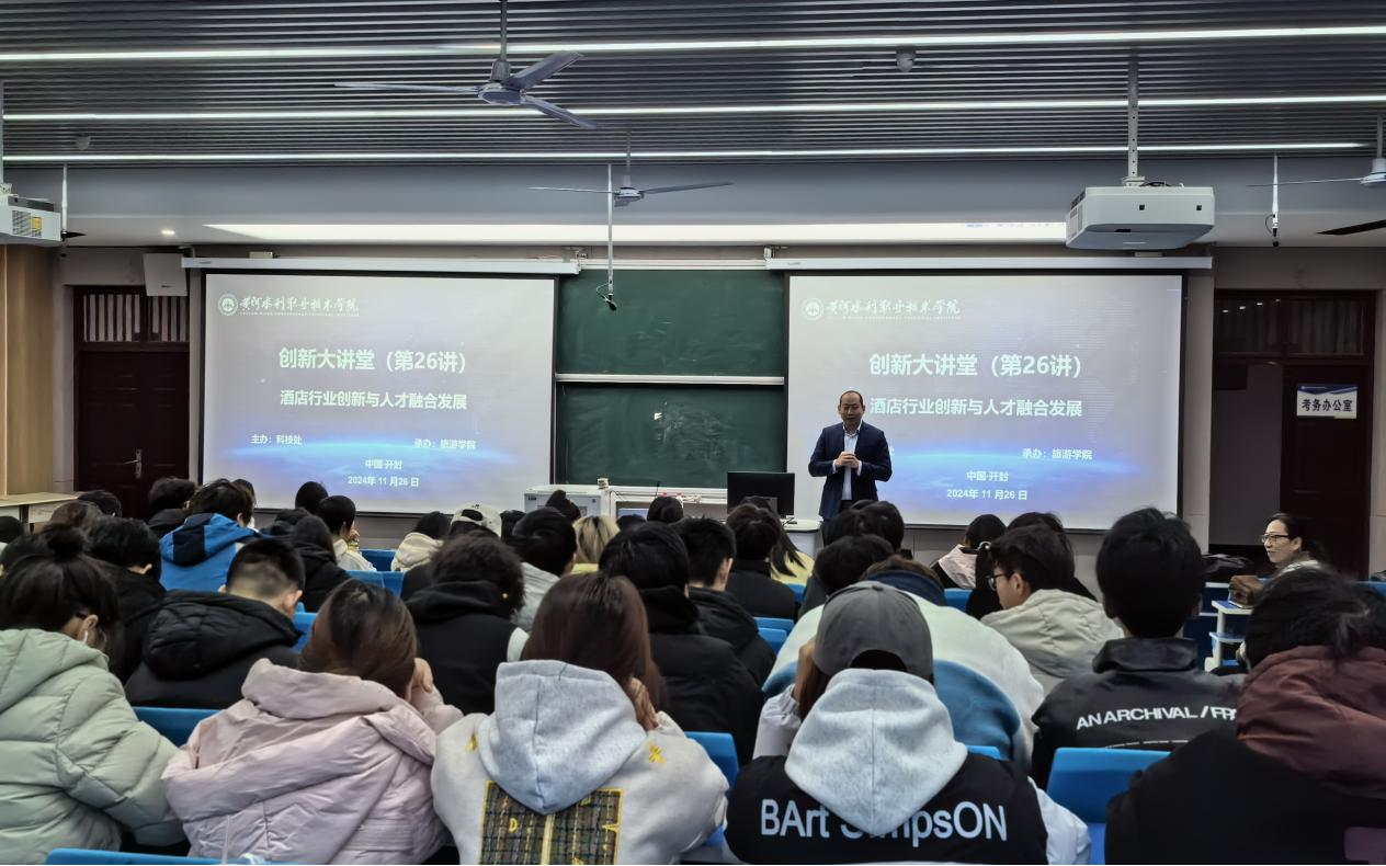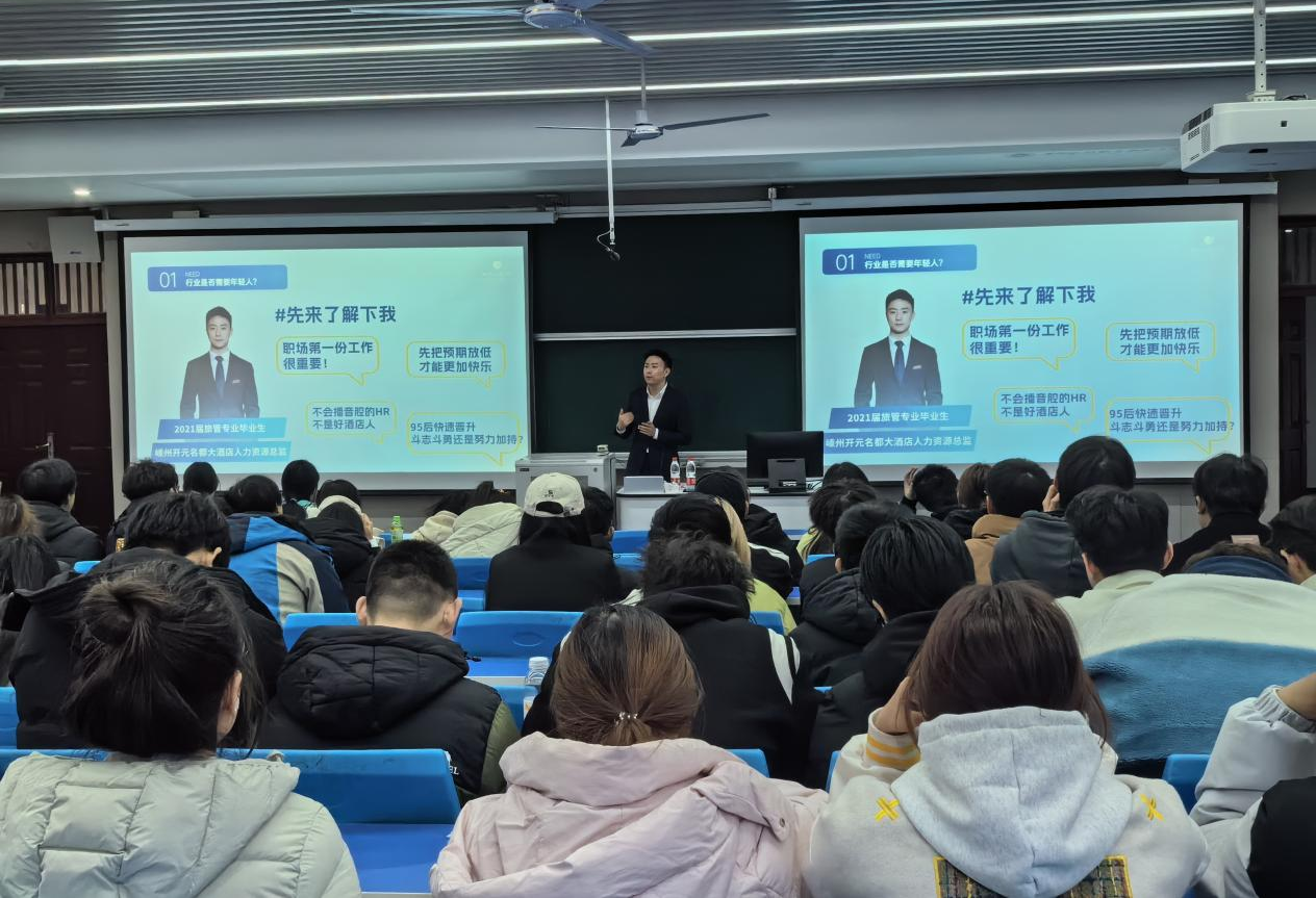 11月26日上午,旅游学院开展了一场总经理进课堂活动,嵊州开元名都大酒店总经理吕刚,酒店教研室全体老师和2024级酒店民宿专业新生参与此次活动,活动由王进副院长主持。吕刚做了一场酒店行业创新与人才融合发展的专业主题讲座。