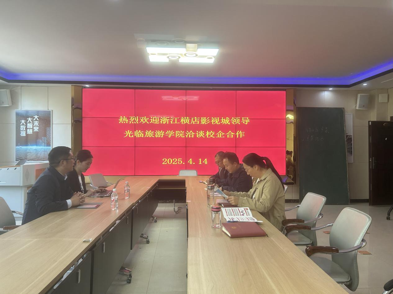 4月14日,浙江横店影视城有限公司一行莅临旅游学院座谈交流,横店影视城人力资源部副部长李建杰、人力资源部主管石慧央,院长王振伟、副院长王进等相关负责人参会。