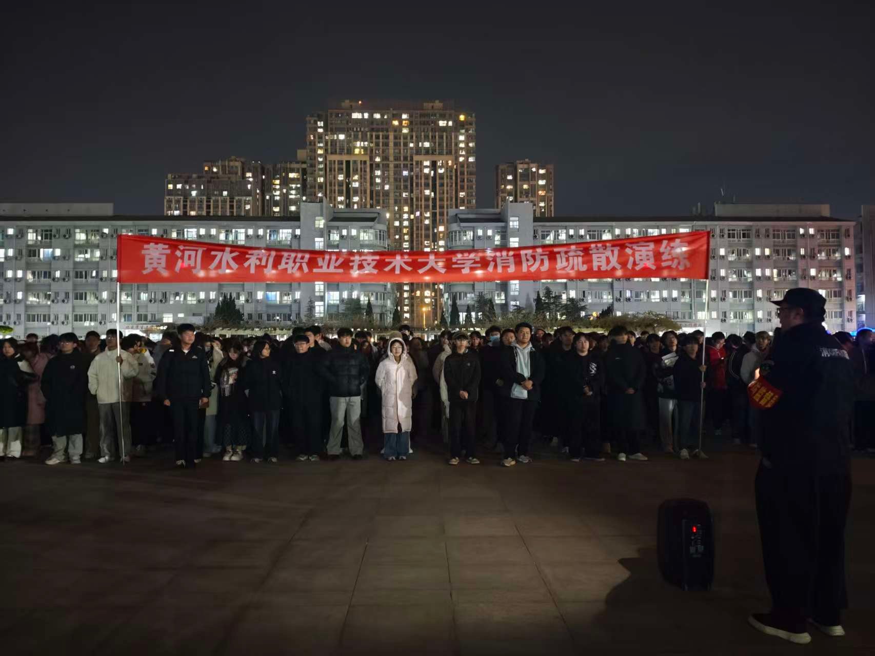 12月4日下午,随着消防警报响起,演练正式启动。按照预定方案,辅导员引导学生手捂口鼻、俯身弯腰,沿指定路线有序撤离至扬帆广场安全区域。整个过程紧张有序,4分钟内完成全员疏散,达到预期效果。