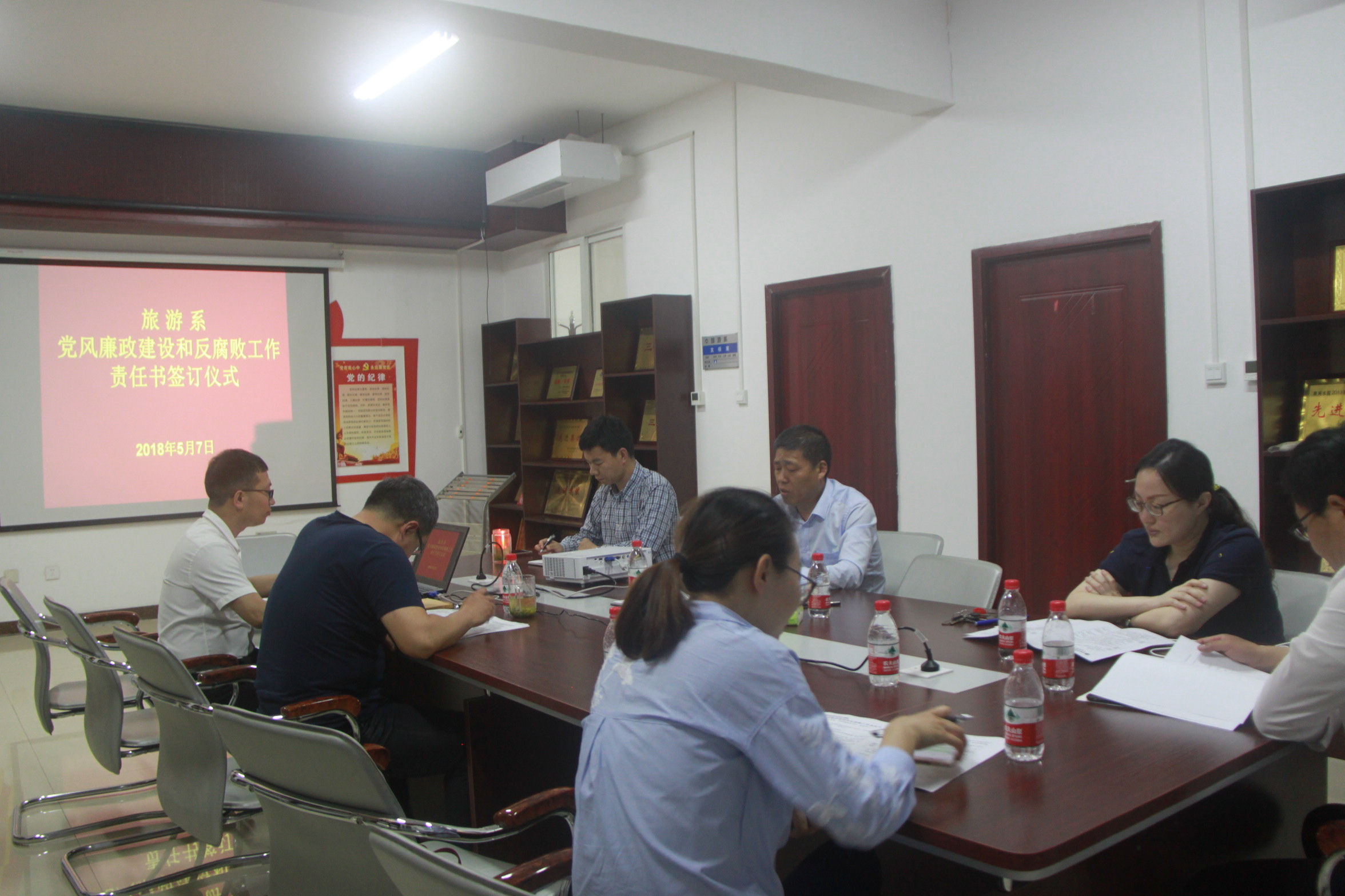 此次专题会议共分为两个阶段。第一阶段,樊书记主要从党风廉政建设和反腐败工作的开展背景,以及重大意义进行了详细的讲解,同时樊书记对校党委的相关文件进行了认真解读。樊书记结合旅游系的实际情况,以及旅游系2018年的日常工作和重点工作,提出了使旅游系党风廉政建设和反腐败工作落到实处,确保各个环节规范、有效运行的要求。紧接着,第二阶段是旅游系党总支组织旅游系班子成员签订党风廉政建设和反腐败工作责任书。旅游系副主任余楠、旅游管理教研室主任徐永红、酒店管理教研室主任宋莎莎、旅游系行政班主任周晓峰、旅游系代理分团委书记张宾宾分别签订了党风廉政建设和反腐败工作责任书。通过责任书的签订,进一步明确了相关人员的责任和义务。