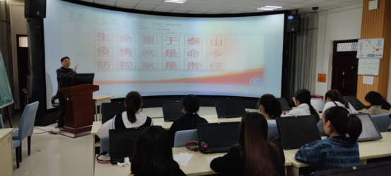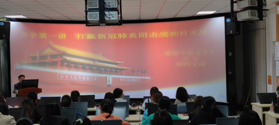 2021316日,为做好学院疫情防控工作,提高学生疫情防控意识,讲好中国抗疫好故事,旅游学院党总支书记刘岩书记在实训楼5102室组织入党积极分子进行开学第一讲—打赢新冠肺炎阻击战和歼灭战。