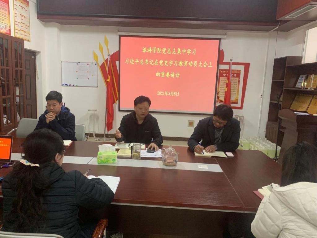 3月8日上午9点,旅游学院党总支委员会各位委员在学院党员活动室,召开会议,深入学习贯彻习近平总书记在党史学习教育动员大会上的重要讲话精神。