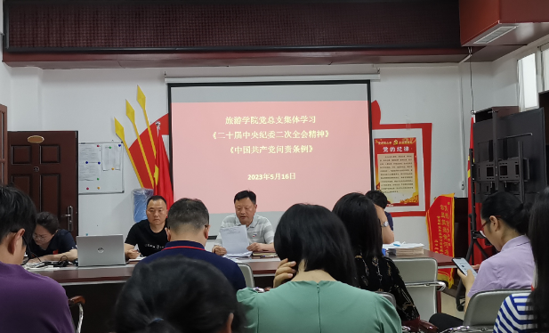 5月16日下午,旅游学院教工支部召开会议,集体学习二十届中央纪委二次全会精神、《中国共产党问责条例》。