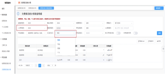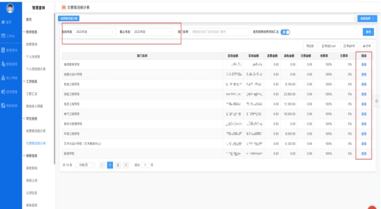 各学院学生欠费情况查询步骤 发布时间:2025-11-15 作者:谷庆玺 浏览次数: 责任编辑:刘振威 关于学院学生欠费明细查询步骤 步骤如下: 登录智慧校园 - 打开财务服务 - 点击智慧查询 - 查看欠费情况统计表 根据需要查看的学生信息选择起始年度,截止年度(此年度指收费年度,比如2022年度,就是学生在2022年的收费信息) 如果需要查看明细,点击右侧“查看”按钮 进入明细查询,可以通过入学年度,离校年度筛选收费信息,通过汇总方式查看专业、班级及个人收费信息。汇总方式选个人,能查询具体欠费学生明细信息。 如图,是旅游学院2022年入学的学生,在2022-2024年的欠费信息。 附件【各学院学生欠费情况查询步骤.docx】已下载次 上一篇: 学生银行卡维护操作步骤 下一篇: 黄河水利职业技术大学关于公布本科学费标准的通知