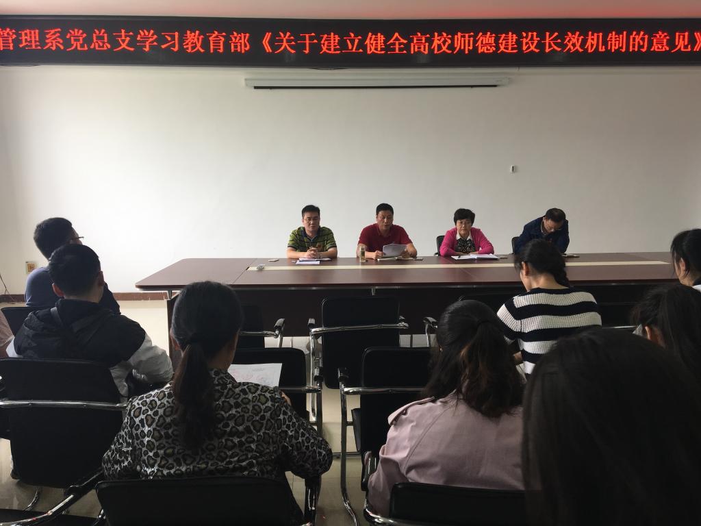 5月22日下午,管理系党总支在系党员活动室开展政治学习。系全体教职员工参加。系党总支书记罗朝峰主持此次学习活动,并领学学教育部《关于建立健全高校师德建设长效机制的意见》;周爱荣主任领学教育部《关于深化高校教师考核评价制度改革的指导意见》;邹新忠副书记领学中共中央国务院《关于全面深化新时代教师队伍建设改革的意见》