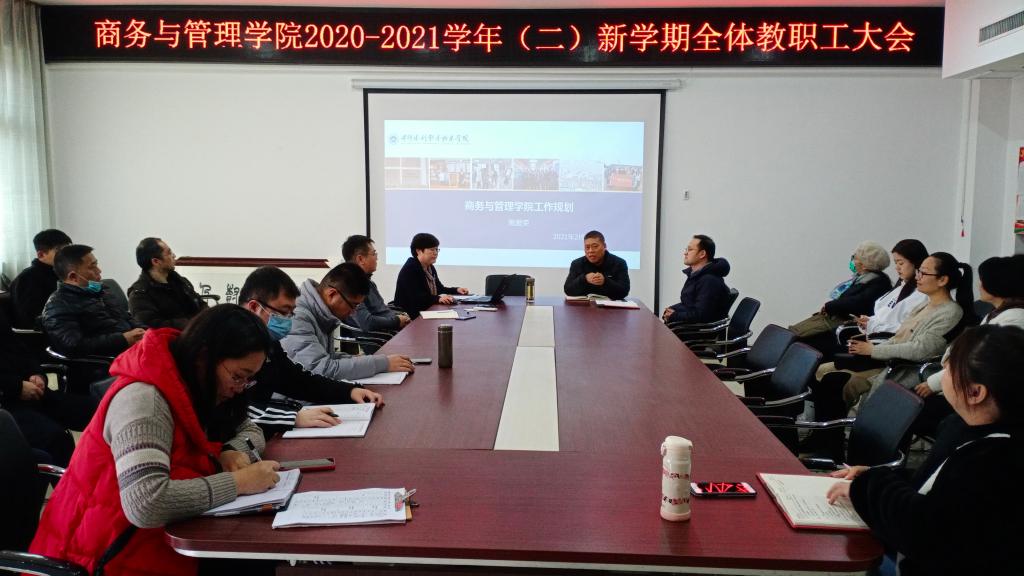 3月2日下午,商务与管理学院在党员活动室SY5420召开新学期全体教职工大会。商管院全体教职工参加会议。会议由书记樊建科主持。