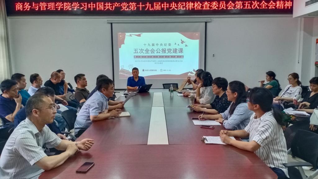 5月25日下午,商务与管理学院在党员活动室SY5420召开政治理论学习会议,集中学习中国共产党第十九届中央纪律检查委员会第五次全会精神、中国共产党河南省第十届纪律检查委员会第六次全体会议精神,结合学习资料《中国共产党简史》进行了改革开放新时期党史历史学习,观看省委宣传部、河南广播电视台联合制作的党史教育专题片《征程》。商务与管理学院全体教职工参加会议。会议由党总支书记樊建科主持。