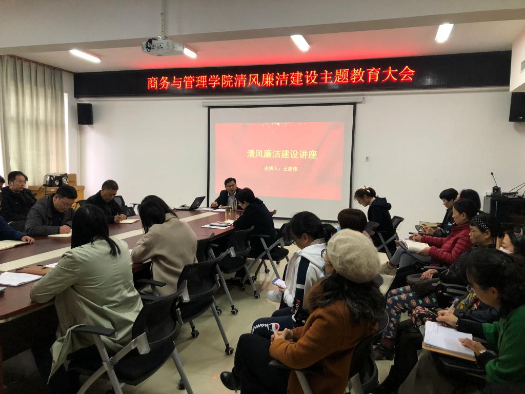 1019日下午,商务与管理学院在党员活动室SY5420召开清风廉洁建设主题教育会议,并邀请校纪委副书记王忠伟作题为“以案为戒、真抓实干、促干部作风建设”的主题讲座。
