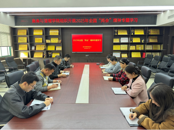 3月11日下午,商务与管理学院党总支在SY5420召开第四周政治理论学习,深入学习贯彻2025年全国两会精神,学院全体行政坐班人员参加会议。