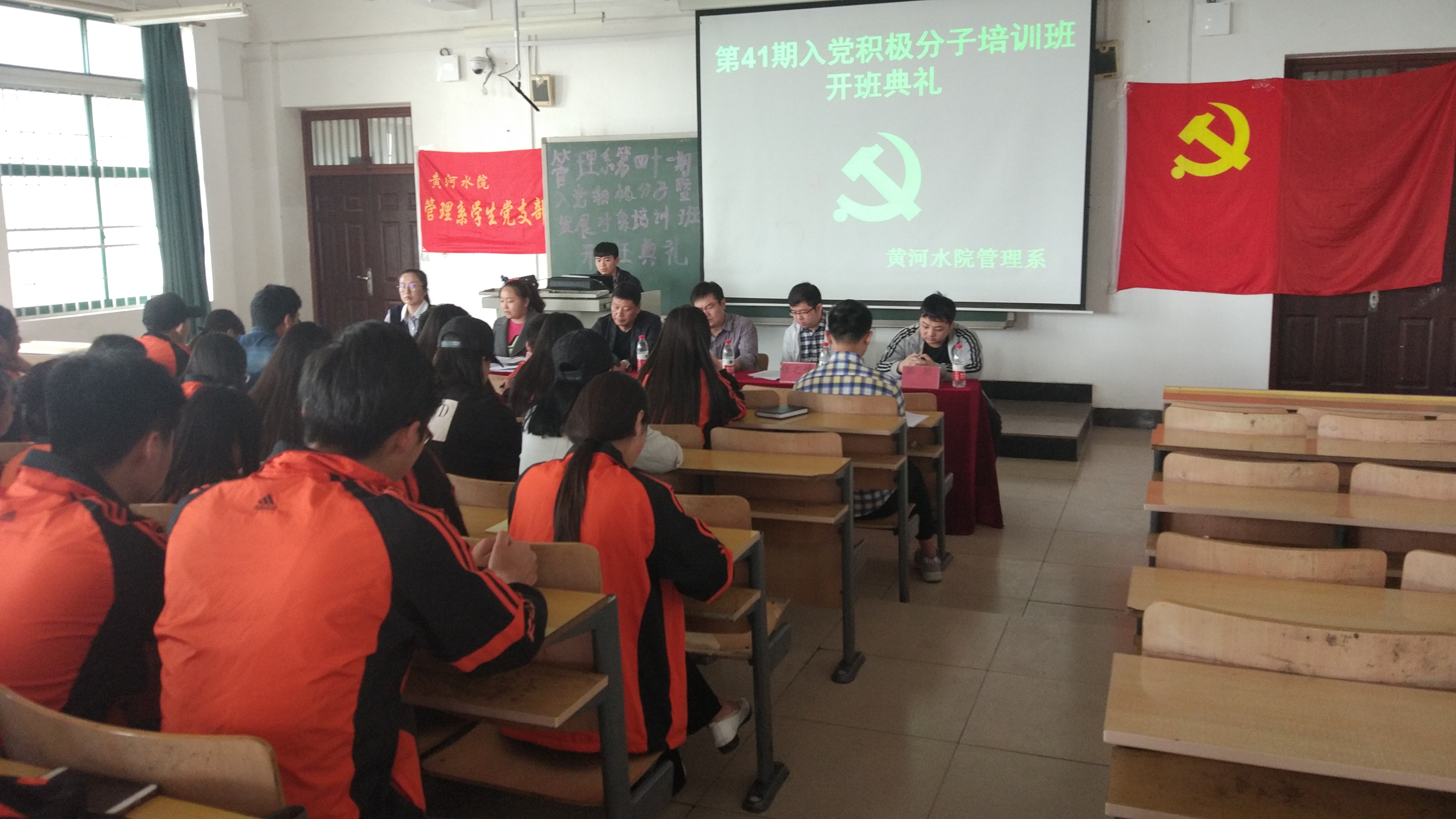 2017年4月15日早8点,管理系第41期入党积极分子暨发展对象培训班开班典礼在JX2303教室顺利召开。管理系党总支书记罗朝峰、副书记邹新忠、学生党支部书记牛钰、2016级辅导员贺若冰、陈思出席了本次党校开班典礼。活动由学生支部书记牛钰担任主持。