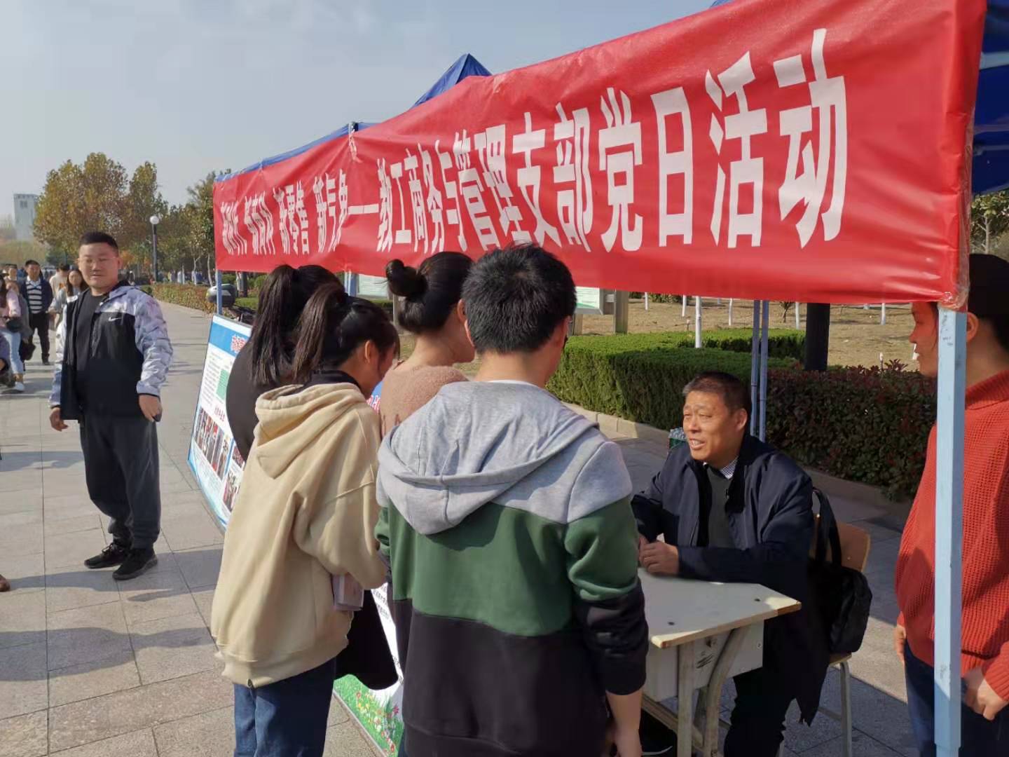11月12日上午 11点至12点30分,教工商务管理支部的部分党员同志在总支书记樊建科的带领下,在学校食堂西侧的青年大道开展现代营销理念与消费者行为现场咨询服务。12点左右,同学们下课后积极参与扫码问卷调查,现场与专业指导老师互动交流,取得了良好的宣传效果。