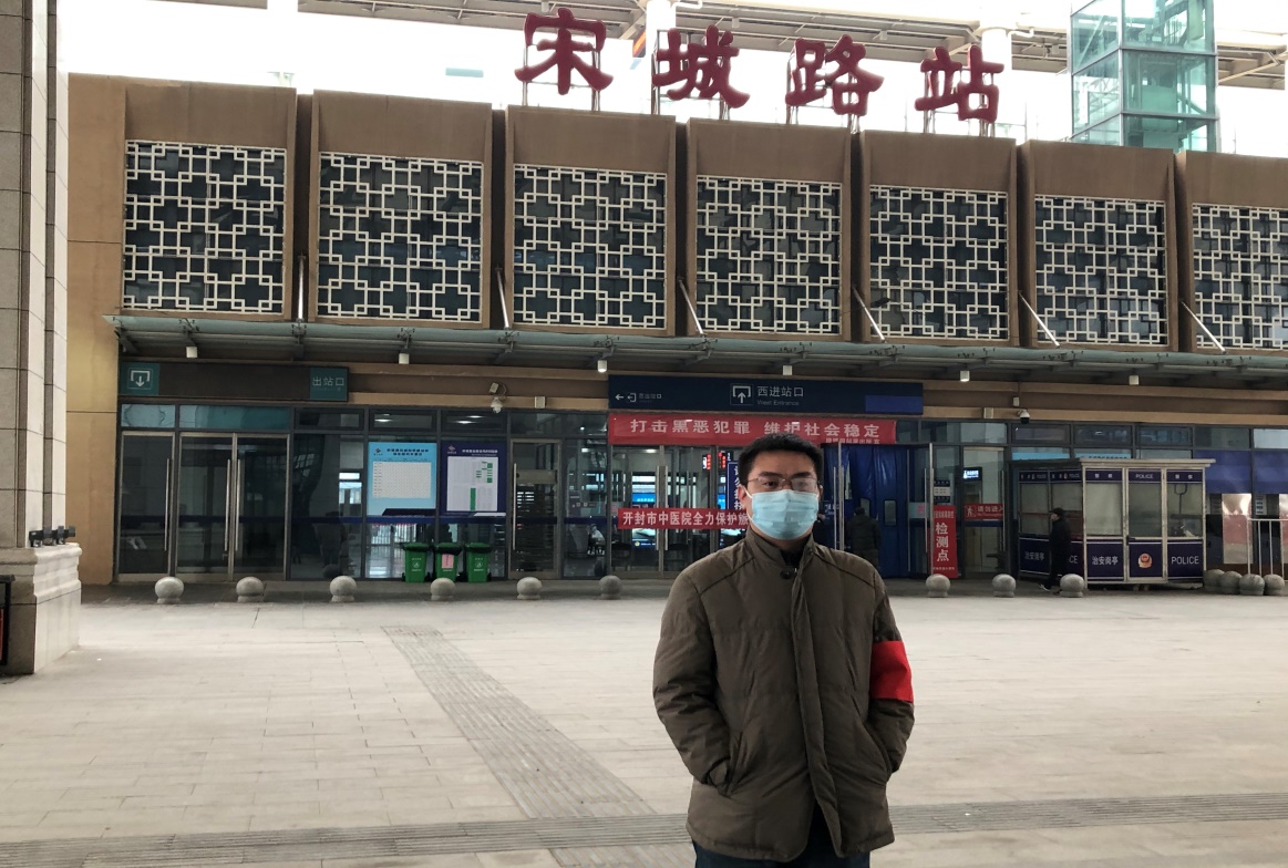 2月5日,根据开封市教体局要求,驻汴高校要派员到3个火车站执勤。接到任务后,没有丝毫犹豫,迎着晨星、冒着风寒,第一个来到开封市宋城站参与疫情防控执勤工作。当日气温陡降,下起大雪,但为了防控疫情,在寒风大雪中认真登记每名旅客的信息;他又接到任务,2月25日将去高铁北站执勤防疫,他已做好了准备。