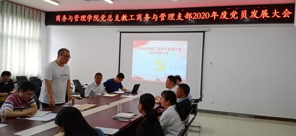 6月18日上午,商务与管理学院党总支教工商务与管理支部在SY5420党员活动室召开2020年度党员发展大会,院党总支书记樊建科、副书记邹新忠、教工商务与管理支部书记程云翔及教工支部全体党员出席大会,教工商务与管理支部发展对象参会。会议由教工商务与管理支部书记程云翔主持。