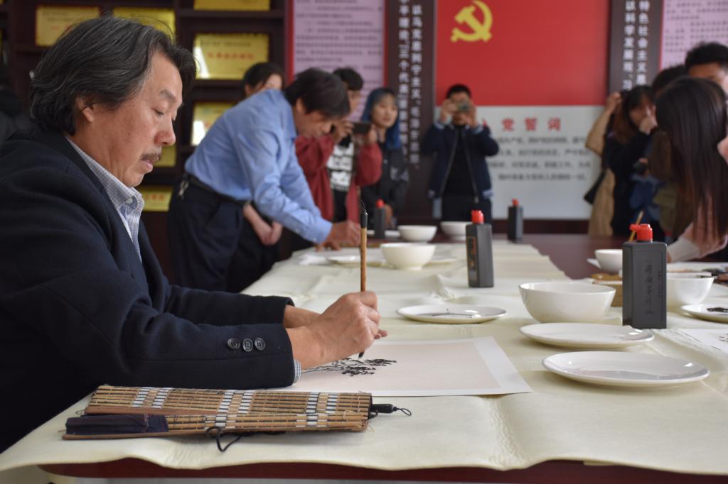 开幕式结束后,开封市兰亭书画院著名书法家齐建立、著名画家赵明月分别做了主题分别为《中国书法艺术欣赏》《美术与中国画赏析》的主题报告。兰亭书画院12位书画家分别在商务与管理学院、环境工程学院党总支党员活动室挥毫泼墨,“厚重”的魏碑、“纤长”的篆书、“潇洒”的行书、“方厚”的楷书、“奔放”的草书、“苗条”的瘦金体让在场师生大饱眼福;出污泥而不染的荷花、傲霜坚韧的菊花、秀丽淡雅的芙蓉、芳香四溢的寿桃、嬉戏打闹的小鸟让在场师生赞不绝口;师生们认真观看书画家匠心运笔,聆听书画家孜孜讲解,近距离深切感受了各位书画家不吝笔墨的开放精神和一丝不苟的艺术品质。现场教学活动从上午9点持续直到中午近13点,师生仍然意犹未尽。