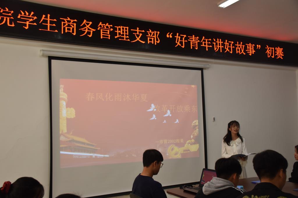 为讲好“四史”故事,大力弘扬爱国主义精神,引导广大党员、入党积极分子、团员从党和国家事业取得的历史性变革和历史性成就中,感悟时代进步和社会发展,按照校党委组织部十一月份党日活动安排,商务与管理学院学生商务管理支部开展了“好青年讲好故事”活动。为选拔优秀人才,活动分为初赛和决赛。分别于11月15日和11月20日在院党员活动室SX5420举办。