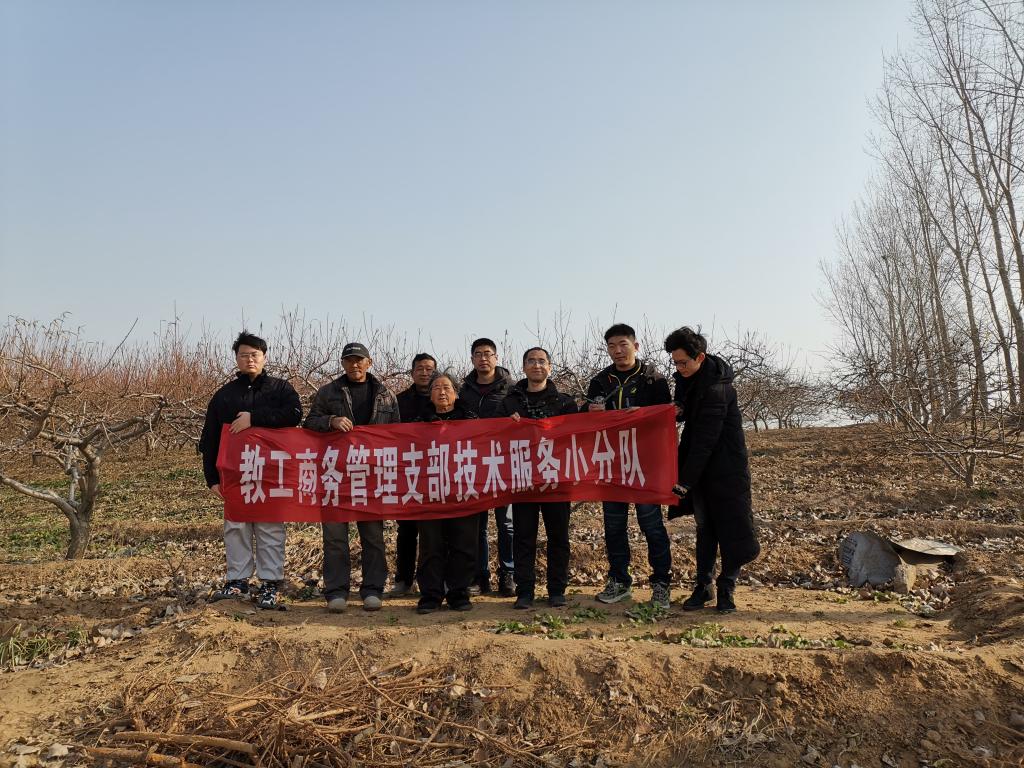2020年12月23日,教工商务管理支部3位党员教师带领专业学生一起,来到尉氏县沙沃村为村民拍摄桃树的冬季护理视频。