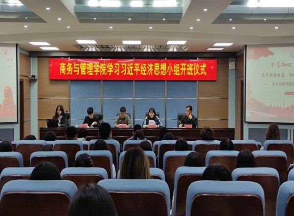 为做好大学生的思想建设,提升大学生的经济素养和基本素质,学思践悟习近平新时代中国特色社会主义经济思想,筑牢思想根基,引导学生通过学习活动,达到学以铸魂、学以提能、学以致用的学习效果,结合我院专业特色,学生党支部决定组织开展大学生学习习近平经济思想兴趣小组活动。4月8日中午,商务与管理学院学习习近平经济思想小组在三号实训楼3301室报告厅举行了开班仪式。我院党总支副书记邹新忠、学生党支部书记、分团委书记牛钰、学生党支部肖星野、陈永胜老师出席会议。学习小组全体同学一百余人到会。