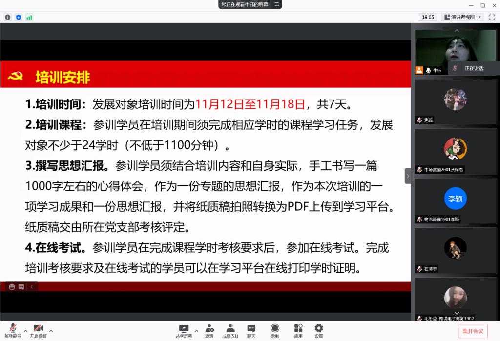 根据当前新型冠状病毒疫情防控实际,减少人群聚集,本期培训依托线上教育平台开展。牛钰老师介绍了培训具体安排、考核要求和平台的操作方法,强调参训成员要认真对待本次学习,认真撰写心得体会和思想汇报,以积极主动的态度来高质量完成培训任务,充分利用此次学习机会,了解中国共产党的思想、性质、宗旨、纪律,增强理论武装头脑指导实践的自觉性,坚定理想信念、端正入党动机。