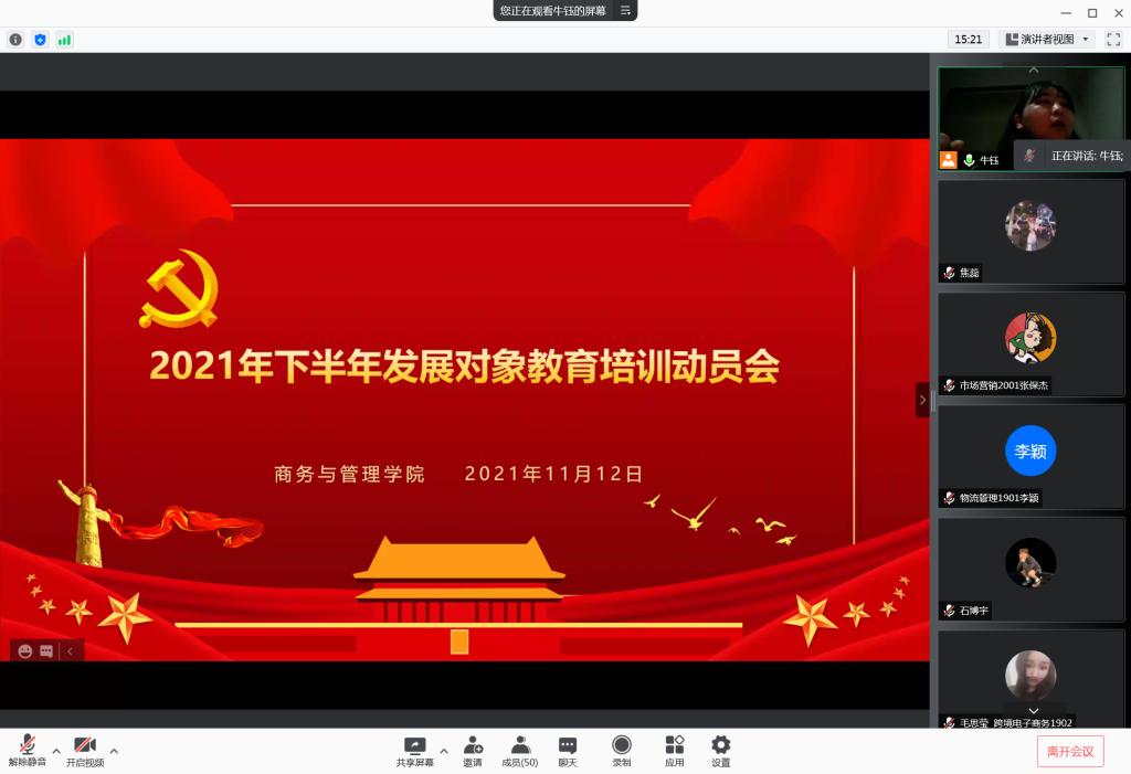 根据学校《关于开展2021年下半年入党积极分子、发展对象和预备党员教育培训工作的通知》要求,为切实落实发展对象的教育培训工作,20211112日晚,商务与管理学院召开线上会议,开展2021年下半年发展对象教育培训动员。学院党总支书记樊建科、副支书记邹新忠、学生支部委员、全体辅导员老师和42名参训发展对象参加了会议。会议由学生党支部书记牛钰主持。