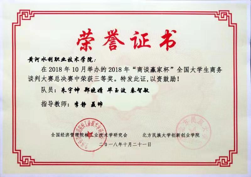 2018年10月,在李静、聂帅2位老师指导下,市场营销专业17级学生朱宇坤、郑晓倩、毕玉波、秦智敏4位同学,经过不懈努力,获得2018“商谈赢家杯”全国大学生商务谈判大赛全国三等奖的好成绩。