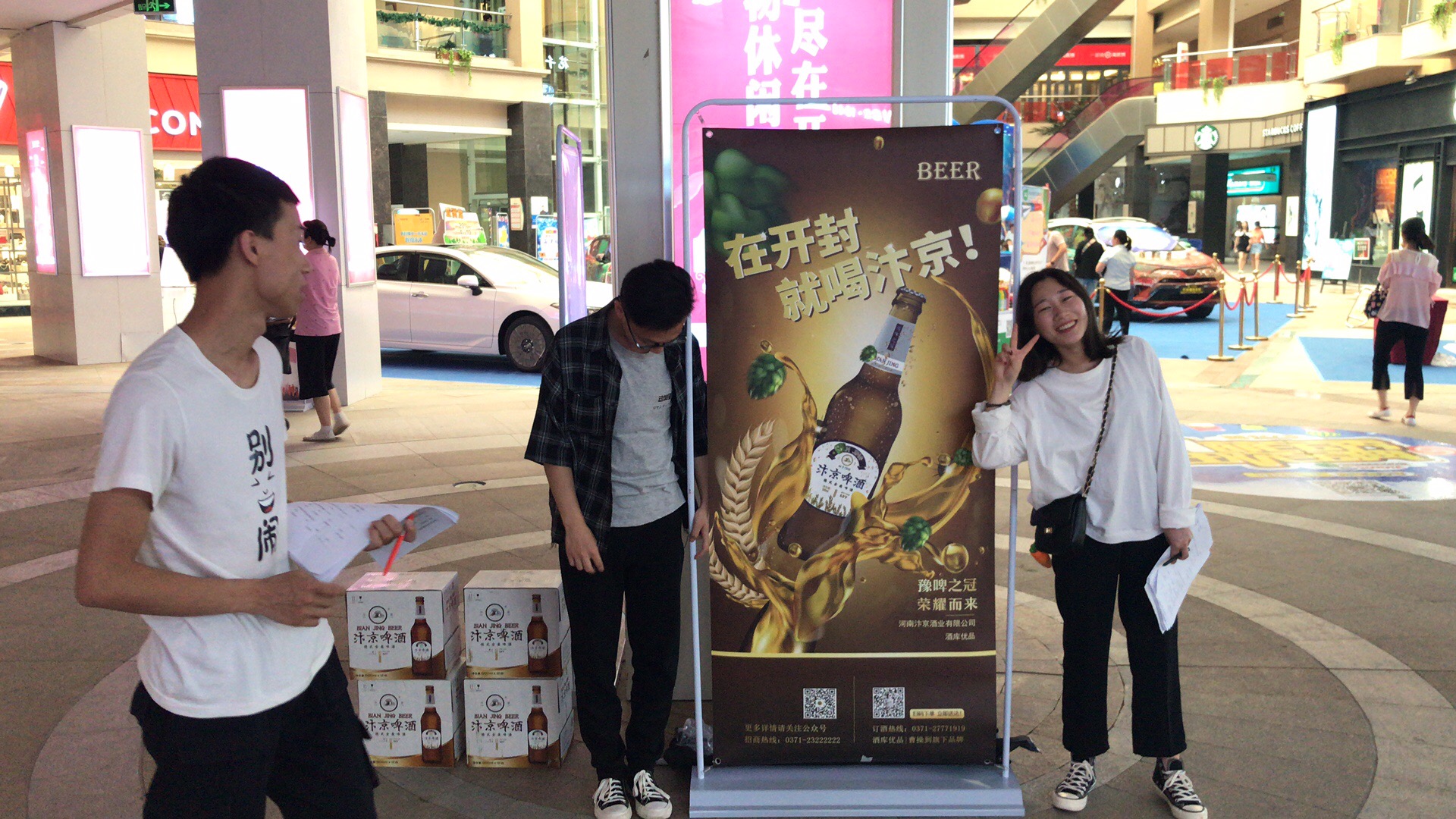 市场营销专业与开封汴京啤酒开展校企合作,6月1日、2日两天,营销17级学生在万达,开元,星光天地和大润发等商业区开展开封市啤酒消费习惯大调查活动。