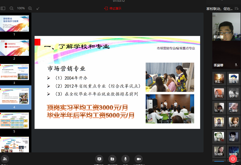 本次活动,首先由教研室主任程云翔介绍了学校和专业发展情况。然后对当前在线学习情况进行了深入分析,结合当前网络时代的学习特点和疫情下经济下行风险中所面对的就业压力,提醒学生及家长当前在线学习不仅具有长期性,还与在校学习一样重要,从而引起学生及家长对当前在线学习的高度重视。最后,建议家长们给予学生们更好地学习氛围和适当的督促,达到家校共同努力,促进学生的在线学习效果。