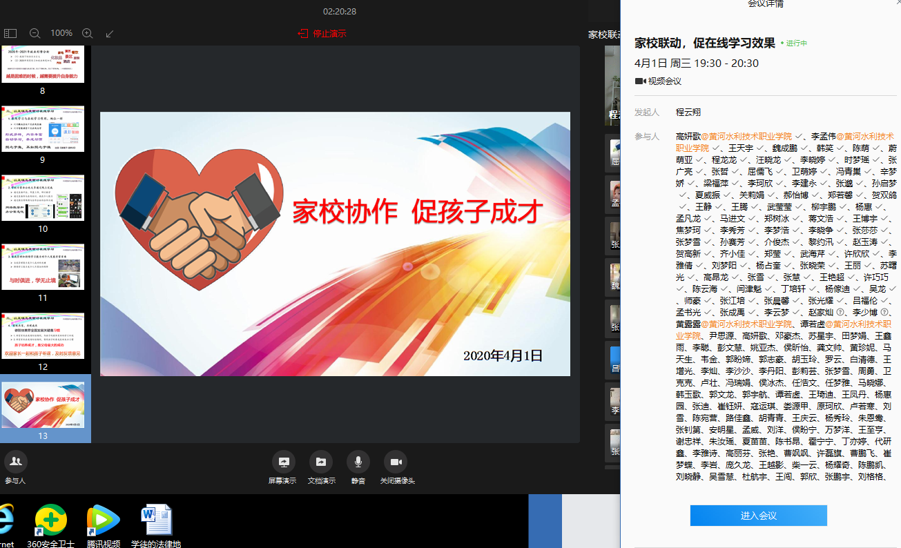 202041日晚,市场营销教研室利用企业微信平台的会议功能,开展“家校联动 促在线学习”交流活动,邀请2018级和2019级全体在校生196人及家长参与会议,但因各种技术问题,实际参会人数178人。