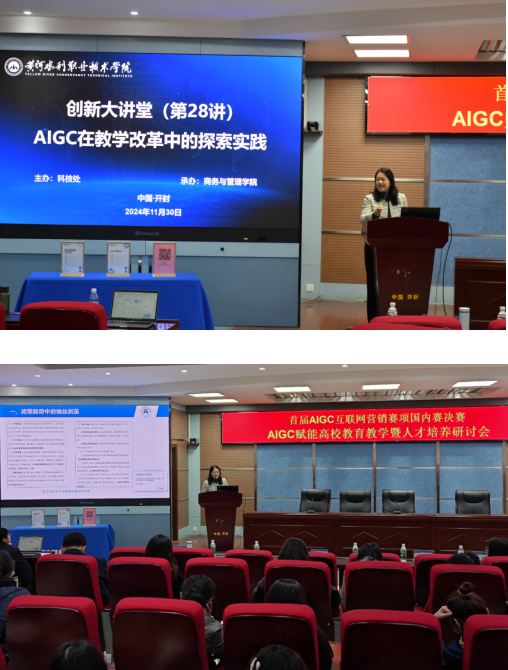 1130日上午,由科技处主办、商务与管理学院承办的“创新大讲堂”第28讲在3号实训楼3301报告厅举办河南财政金融学院工商管理学院副院长李瑶受邀开展讲座,首届AIGC互联网营销国内决赛的参赛指导教师、商务与管理学院教师学校各专业部分学生参加此次讲座。讲座由我副院长曹玉华主持。