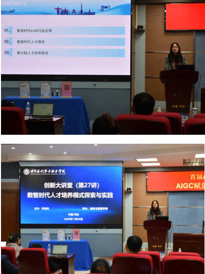 1130日上午,由科技处主办、商务与管理学院承办的“创新大讲堂”第273号实训楼3301报告厅举办北京新大陆时代科技有限公司商科产教融合专家耿天霞受邀开展讲座首届AIGC互联网营销国内决赛的参赛指导教师、商务与管理学院教师学校各专业部分学生参加此次讲座讲座由我副院长曹玉华主持。