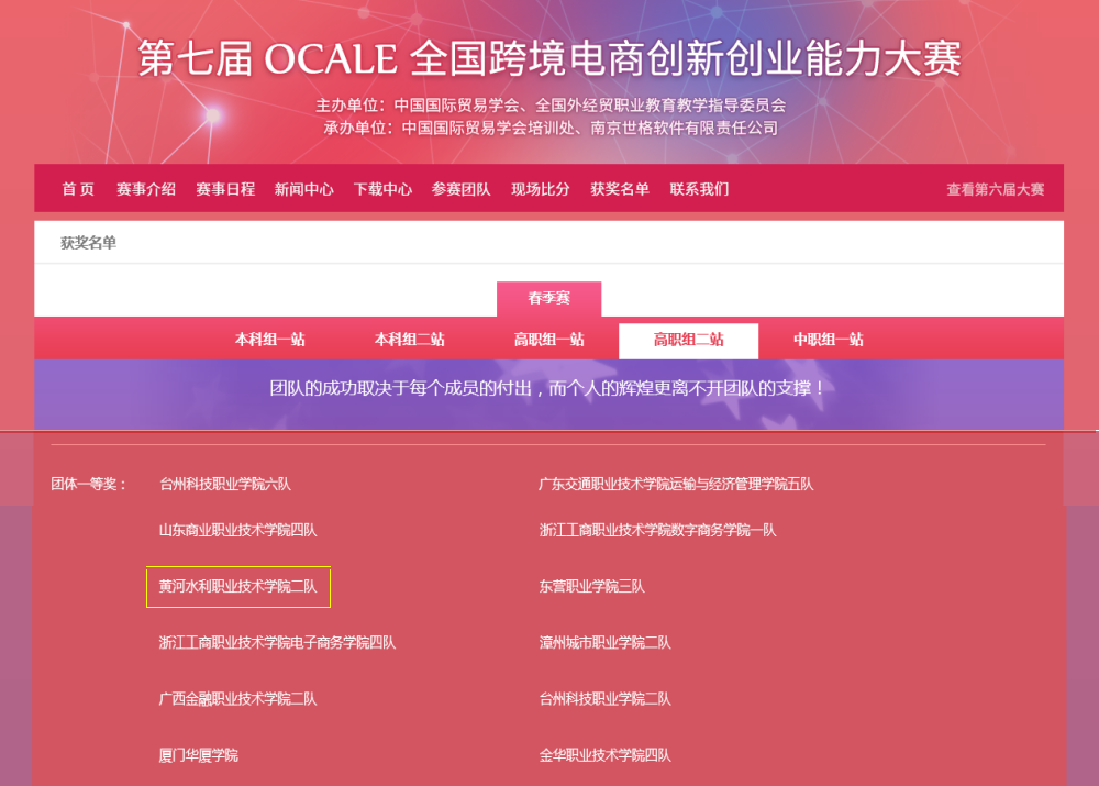 近日,在由中国国际贸易学会、全国外经贸职业教育教学指导委员会举办的第七届OCALE全国跨境电商创新创业能力大赛(春季赛)中,我校商务与管理学院参赛的2支代表队,分别斩获团体一等奖1项、团体二等奖1项,取得历史最好成绩。