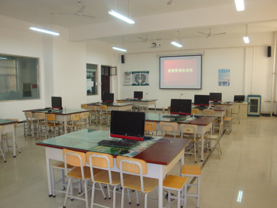 管理系建有校内仿真实训室: ERP 物理沙盘模拟实训室、物流仓储分拣实训室、商务礼仪实训室;校内模拟实训室:物流管理、市场营销、连锁企业经营管理、电子商务相关软件模拟实训室。建有专业计算机室,配备计算机 300余台,装配各类经营管理实训软件近二十款。