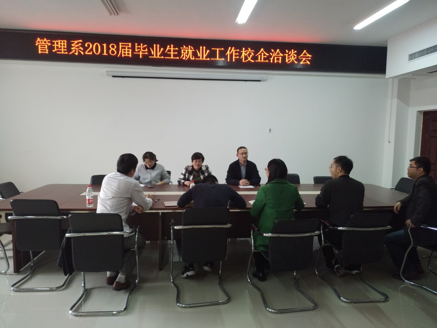 为进一步深化校企合作,实现学校、企业、社会等多方共赢,借着我校2018届毕业生就业首场双选会的最佳时机,10月27日下午,我系邀请企业召开2018届毕业生就业工作校企洽谈会,来自天地华宇物流公司的人事经理尹贝磊、河南行创网络科技有限公司经理孔德超、河南鲜风商业连锁有限公司人力资源总监张翔参加了我系校企合作洽谈会。系主任周爱荣、副主任吕梁参加了座谈会。