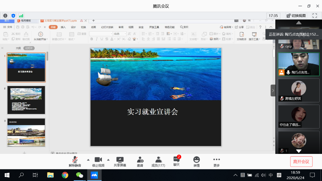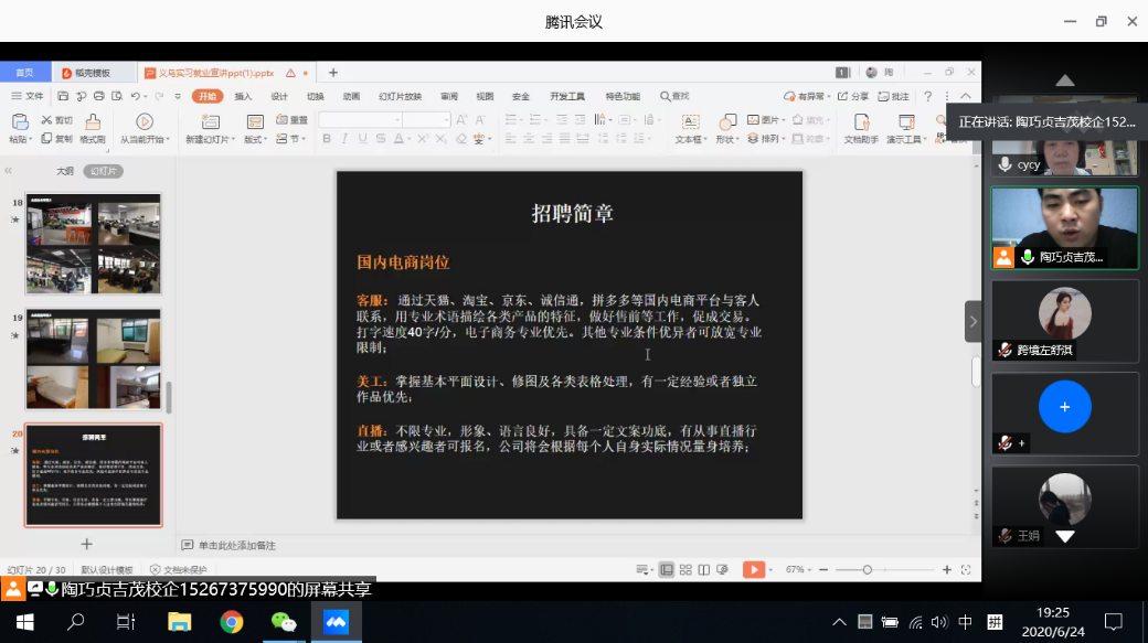 我院18级电商大类专业学生校外实习即将开始,学院多方考察,为电商大类专业联系了十多家企业。6月24日18:55至20:30,电商教研室和网络营销教研室组织义乌带路网络科技有限公司通过腾讯会议进行了招聘宣讲,来自电商、跨境电商和网络营销专业的170多名学生参加了此次宣讲会。