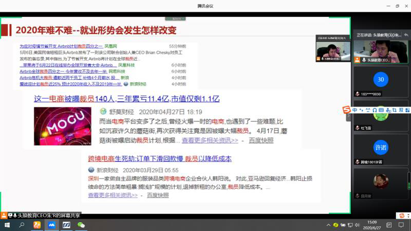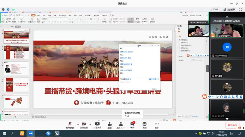 2020年6月27日上午15:00,广东头狼教育科技有限公司通过腾讯会议进行了招聘宣讲,来自电商、跨境电商和网络营销专业的170多名学生参加了此次宣讲会。