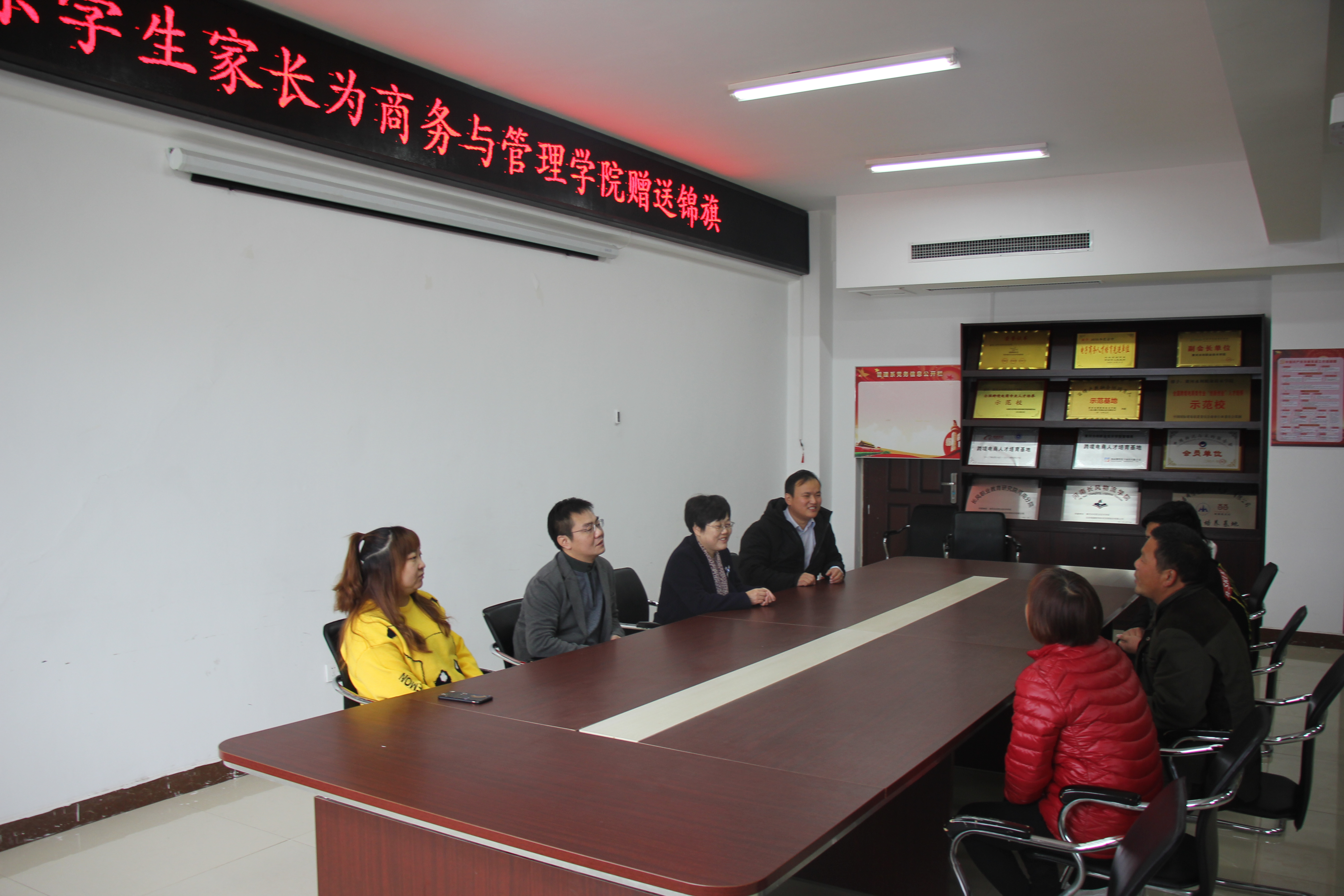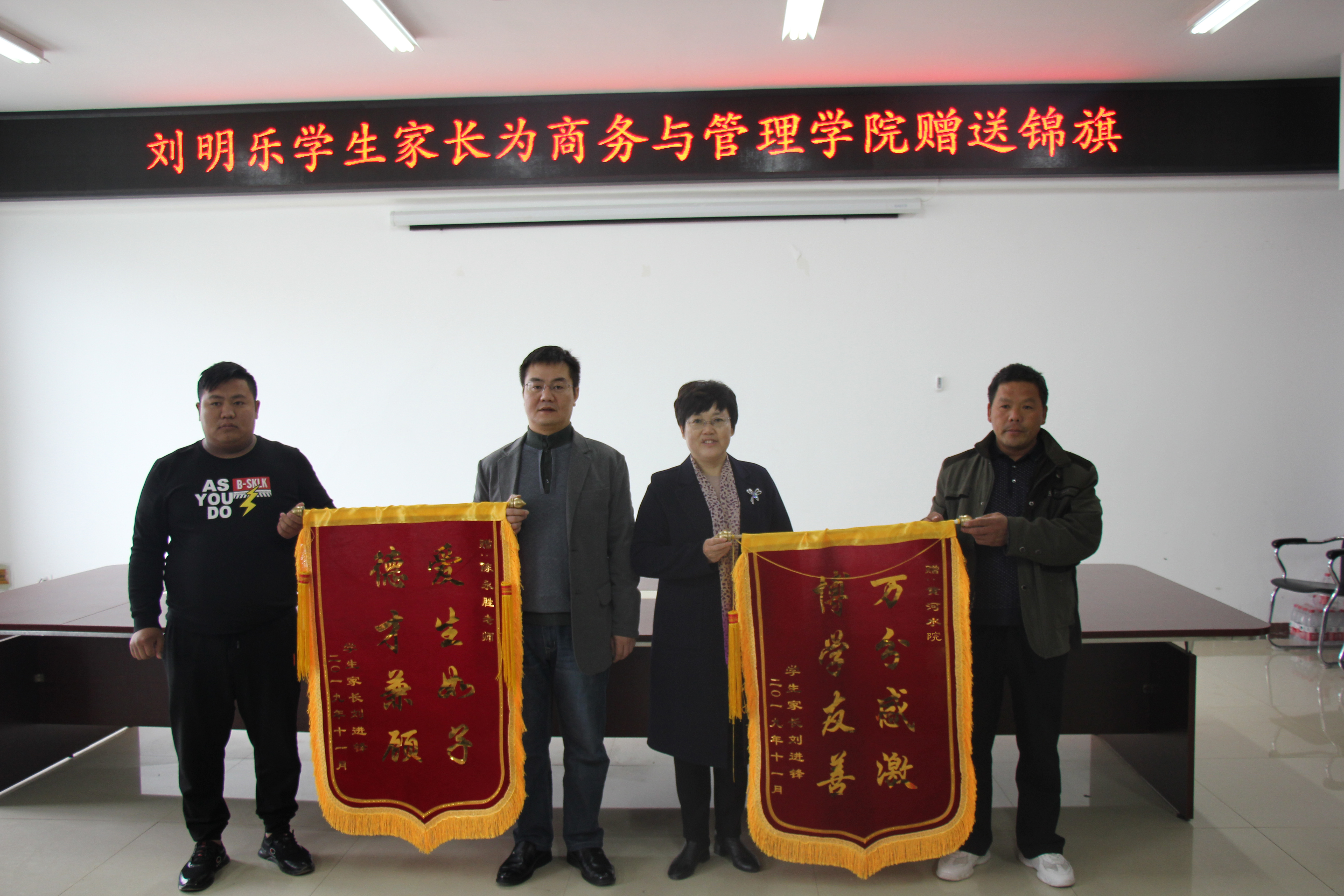 冬冷已至,但情暖商管院。为了表达对我校商务与管理学院的感激之情,2019年11月21日上午8:30,刘明乐同学及其家长一行特向商管院赠送了锦旗两面。赠旗仪式的主要参与人员有刘明乐同学及其家长、商务与管理学院院长周爱荣老师、院党总支副书记邹新忠老师和分团委书记牛钰老师、辅导员陈永胜老师等。