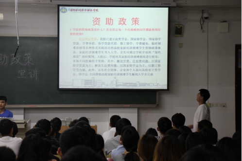 本次宣讲上先详细讲解了我校“先自助后资助”的核心资助政策体系。即当贫困同学考入我校时以“绿色通道”保证能按时到校报道,入校后根据家庭情况不同采取不同措施给予资助,让每一个有困难的学生都能够得到有效的资助。其中,解决学费、住宿费问题,以国家助学贷款为主;解决生活费问题,以国家助学金为主,勤工俭学为辅。此外,还有社会团体、企业和个人面向高校设立奖学金、助学金,共同帮助高校家庭经济困难学生顺利入学并完成。