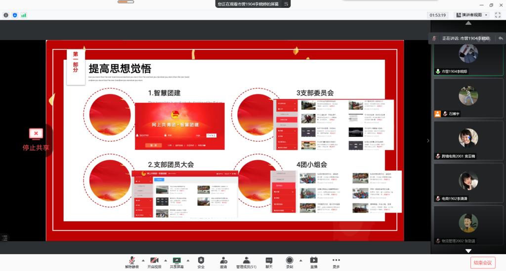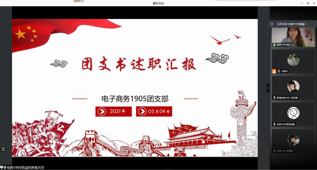 为贯彻落实团中央《关于印发<基层团组织书记述职评议考核暂行办法>的通知》精神和全面从严治团要求,激发我院团支部活力,提高工作部署的落实成效,提升我院共青团工作水平,2021年3月4日,我院召开2020年度团支部书记述职评议考核工作线上会议,对商务与管理学院39位基层团支部书记进行述职考核。
