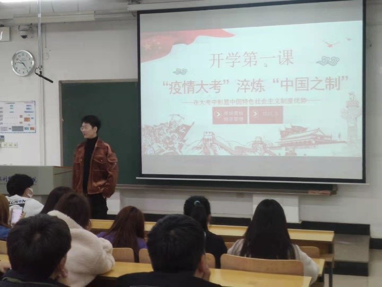 3月14日下午2019级辅导员肖星野,组织市场营销专业体学生于JX2203室,召开开学第一课“疫情大考”淬炼“中国之制”主题班会。会上,肖老师为同学们讲到:新学期开始,虽然新冠疫情对我们的学习和生活带来了很大影响,但是从目前情况来看,我国早已控制疫情。这场突如其来的战役考验着我们应对重大风险的能力,凸显了“中国之制”的显著优势,也进一步淬炼着“中国之制”,使其更加趋于成熟和完善。肖老师为同学们讲解在校注意事项,提醒同学们在宿舍中,时刻注重宿舍卫生,安全用电,少熬夜,养成良好的生活习惯,提升生活质量。在吃饭就餐问题上,学校处于封校状态,一定要去餐厅就餐,尽量不要点外卖,外卖虽然方便,但质量卫生方面不能保证,会危害大家健康安全。网络安全方面,肖老师讲到,随着我国经济与科技的不断发展,学习知识、获取信息和休闲娱乐平台较多,给大家带来很大帮助,但我们必须清醒地看到,大量不良信息内容以及诈骗广告等也在通过互联网进行传播,这已成为日益突出的社会问题,所以我们要树立网络安全意识、加强自我保护能力,谨防网络诈骗。最后,肖老师叮嘱大家,为了保证大家在校期间的人身安全,同学们一点要严格遵守学校各项规定,在宿舍内禁止出现抽烟或携带打火机的情况;严禁使用大功率电器,私自接通电线插盘;学校处于封闭式管理期间,同学们如果遇到特殊情况,需要离校解决,要及时与老师取得联系解决。