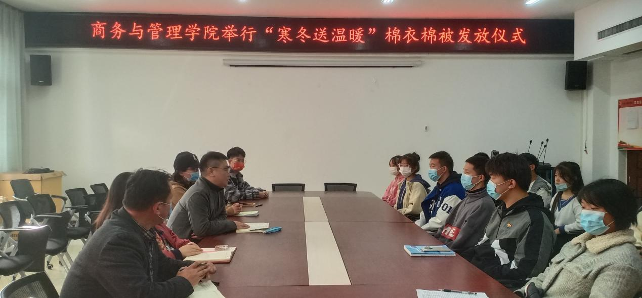 立冬以后,气温骤降,为第一时间给同学们送去温暖,11月12日下午,商务与管理学院在SY5420开展“寒冬送温暖”棉被棉衣发放仪式。学院党总支副书记邹新忠、分团委书记牛钰、各级辅导员及学生代表参加,会议由资助专员肖星野老师主持。