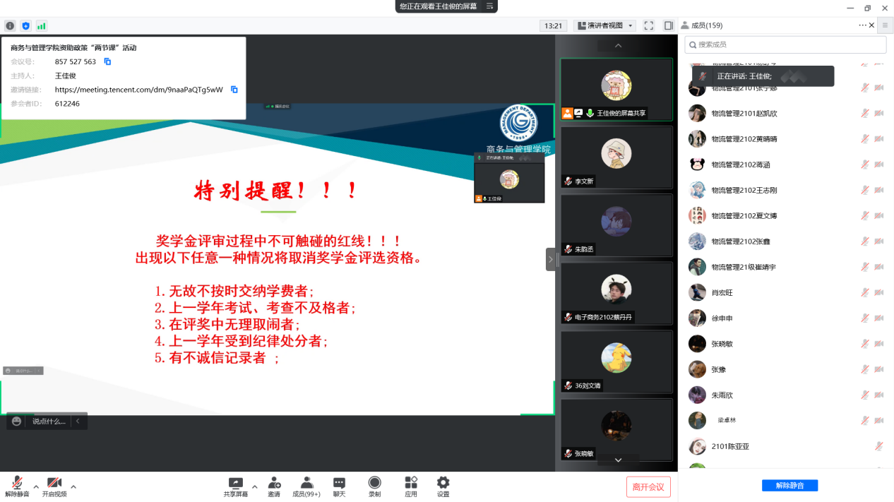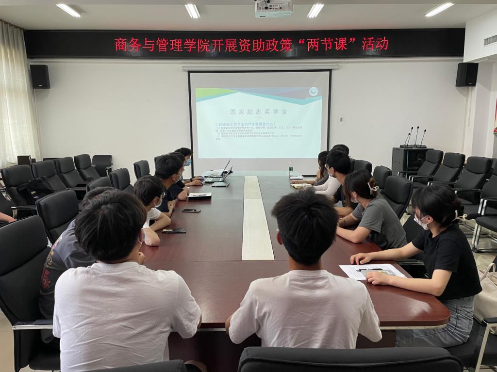 为进一步推动资助工作,全面落实贯彻国家政策,让新同学们了解国家资助政策,商务与管理学院于2022年5月6日SY5420开展了以资助政策“两节课”为主题的活动,为响应疫情防控形式,此次活动形式采取了21级班长团支书线下参加,21级全体同学腾讯会议线上参加相结合的形式。