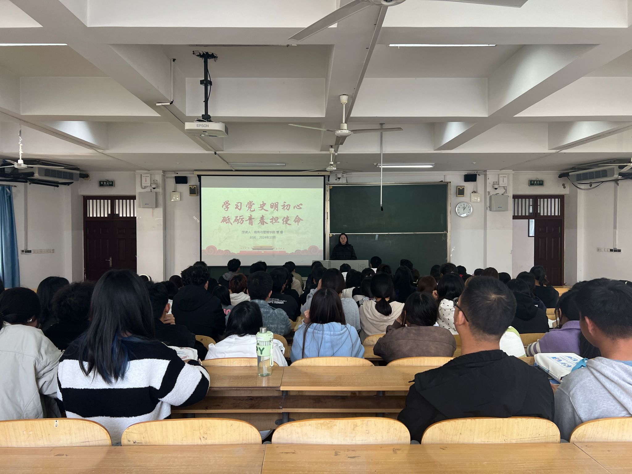 2024年10月29日,商务与管理学院党总支副书记曹睿在JX6202教室为本期学院业余团校学员上“学习党史明初心,砥砺青春担使命”主题团课。