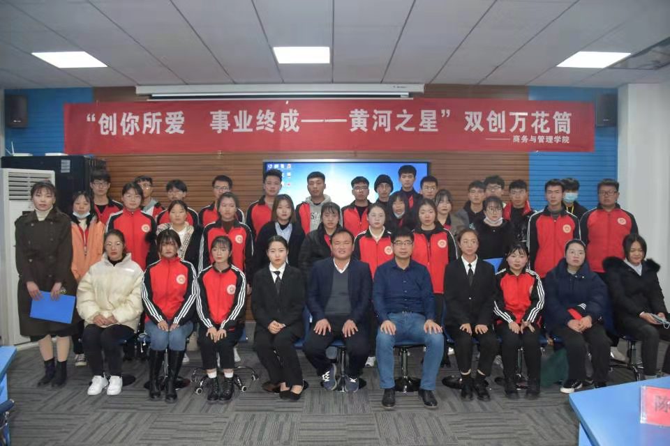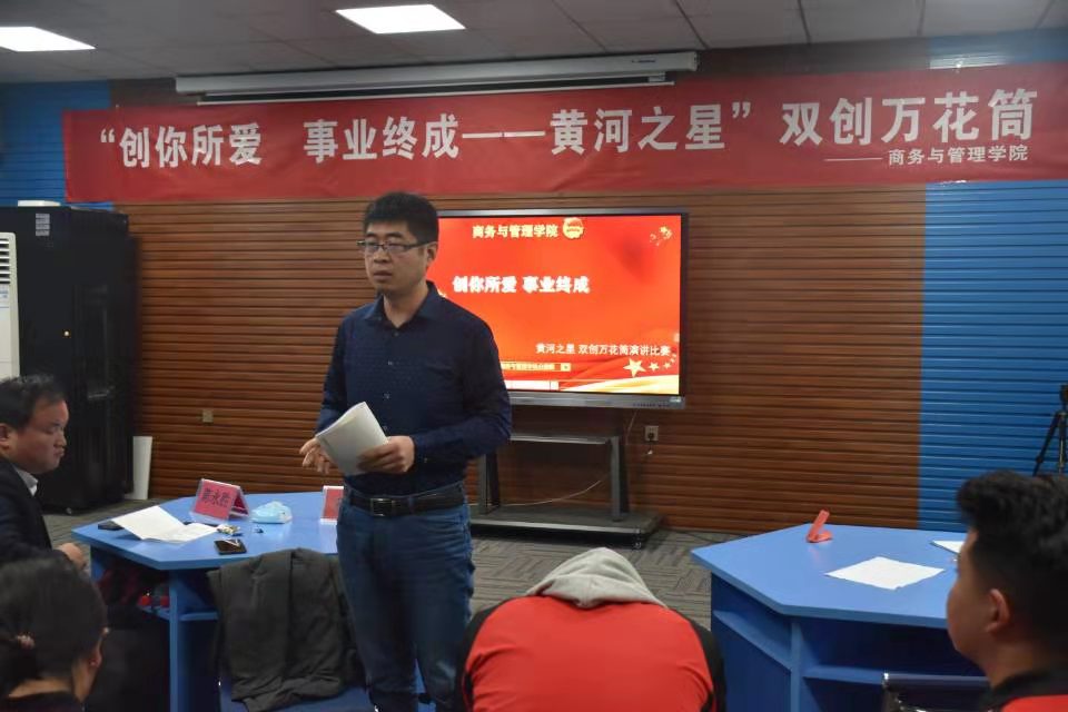2020年12月13日上午,由商务与管理学院党总支发起,学院校企合作办公室、分团委组织的“创你所爱,事业终成——黄河之星”双创万花筒比赛在JX7211举行。此次比赛共有19组选手参赛,分别来自学院电子商务、跨境电商、网络营销、物流管理、市场营销等专业。比赛于上午8点30分正式开始,出席担任比赛评委的教师是教工党支部书记程云翔、2019级辅导员陈永胜。
