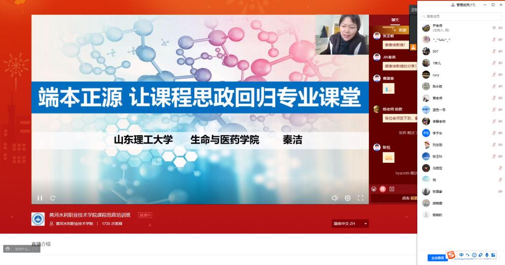 本次培训通过线上方式进行,持续两天。黄百炼、苗旺、徐金寿、秦洁等课程思政教学名师分别以《深入学习习近平新时代教育的重要论述 开启高等教育现代化建设新征程》、《从理念到行动:课程思政再认知与“四步法”实施路径》、《新时代教育和课程思政的认识、方法与实践》和《端本正源 让课程思政回归专业课堂》为题进行了专题培训,从课程思政的理论来源到课程思政的实践途径,指导老师们在尊重教育教学规律、与学生需求相适应的基础上进行课程思政的融入。