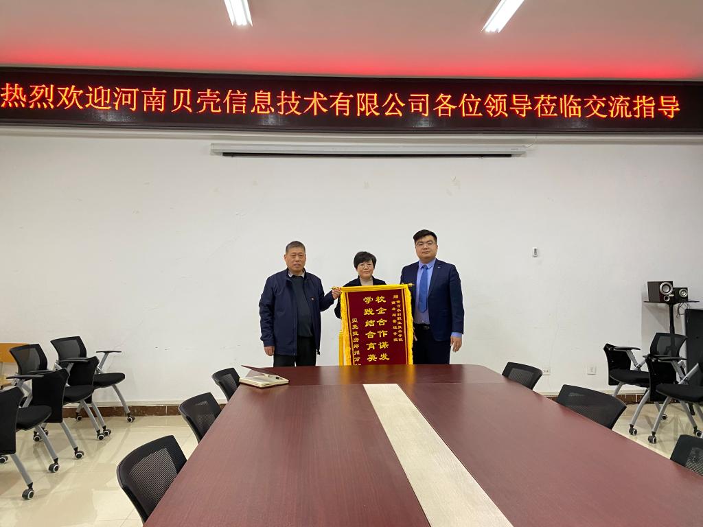 12月8日,河南贝壳信息技术有限公司陈家乐经理代表公司向我校商务与管理学院赠送了“校企合作谋发展,学践结合育英才”的锦旗,校企双方就业产教融合育人方面进行深入交流。