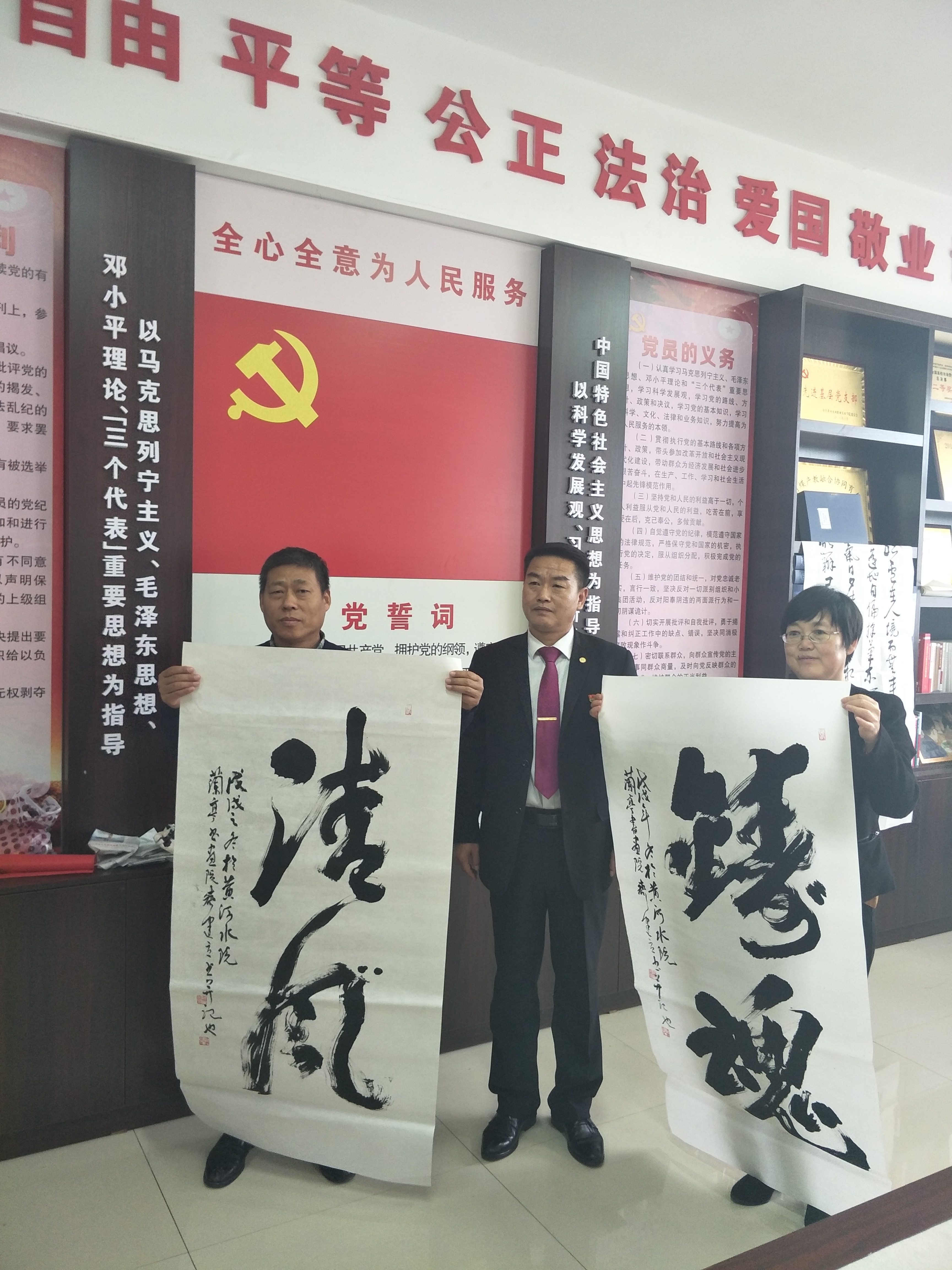 主题党日活动的第二个部分是现场教学与互动环节,3位著名书法家和2位著名画家挥毫喷墨向在场师生展示了魏碑体、瘦金体、楷书、草书、山水、花鸟等书画艺术。教学互动活动12月2日上午同时开始,由商务与管理学院院长周爱荣同志主持,教工党支部全体党员、非党员教师及部分学生书法爱好者参与了活动。“纤长”的篆书、“潇洒”的行书、“方厚”的楷书、“奔放”的草书、苗条的瘦金体让在场师生大饱眼福;出污泥而不染的婷婷玉立的荷花、傲霜坚韧的菊花、秀丽淡雅的芙蓉、芳香四溢的寿桃、嬉戏打闹的小鸟让在场师生赞不绝口;在欣赏党风廉政教育的对联、励志的扇屏、经典名言的条幅等艺术品中,让党员同志们收益非浅,各位书画家不吝笔墨的开放精神和一丝不苟的艺术品质充分体现了中华传统文化之美。直到中午1:30,师生仍然意犹未尽。齐建立先生用两幅狂草“清风”、“铸魂”为此次活动划上了圆满的句号。