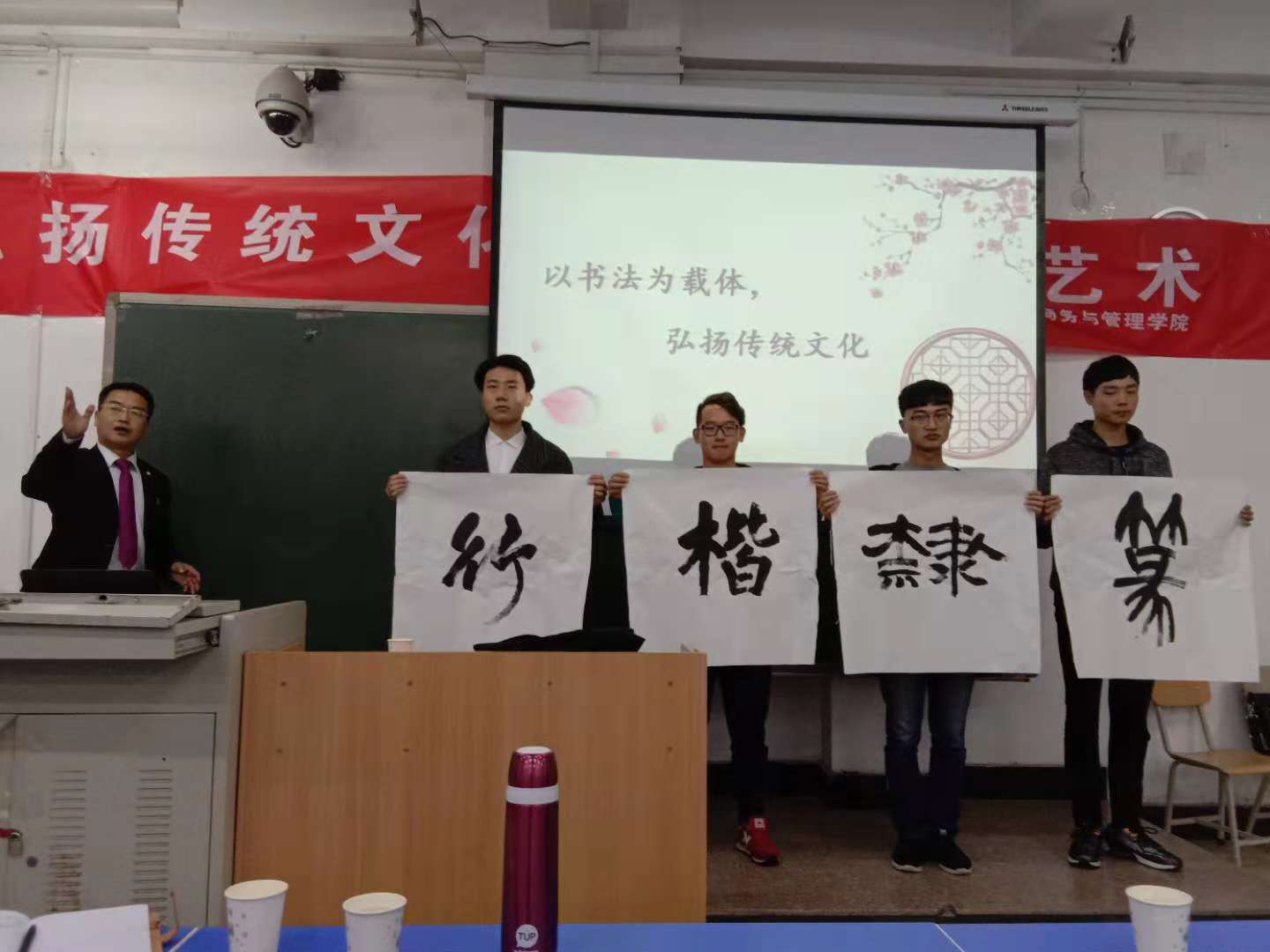 党中央、国务院非常重视中华优秀传统文化的传承,2017年1月25日,中共中央办公厅、国务院办公厅为建设社会主义文化强国,增强国家文化软实力,实现中华民族伟大复兴的中国梦发布并实施《关于实施中华优秀传统文化传承发展工程的意见》。《意见》对如何实施中华优秀传统文化传承发展工程做出了具体要求,其中要求要将中华优秀传统文化贯穿国民教育始终,善于从中华文化资源宝库中提炼题材、获取灵感、汲取养分,滋养文艺创作,加强对中华诗词、音乐舞蹈、书法绘画等的扶持。商务与管理学院党总支按照学校党委组织部的文件精神,根据本学期主题党日活动计划,12月2日上午,如期举办主题为“弘扬传统文化,传承书画艺术”的党日活动,活动的第一部分是由开封兰亭书画院副院长兼秘书长、著名楷体书法家齐建立先生做题为“弘扬传统文化,传承书画艺术”的专题报告,报告会由商务与管理学院党总支书记樊建科同志主持,学生党支部全体党员及部分入党积极分子约200人齐聚教学楼2102聆听了报告。齐建立老师从中华传统文化艺术起源讲起,以书法绘画为例,现场展示、互动交流,带领在场师生切身体会中华优秀传统文化的丰富内涵,感受中华传统文化之美妙。正如齐建立老师讲到的“字如其人,字书其性”,书法绘画艺术是中华传统文化的重要组成部分,都具有“形神兼备”的特点。当代大学生必须担当起文化传承的历史重任。报告结束,党总支还组织师生举行了“弘扬传统文化 传承书画艺术”签名活动。