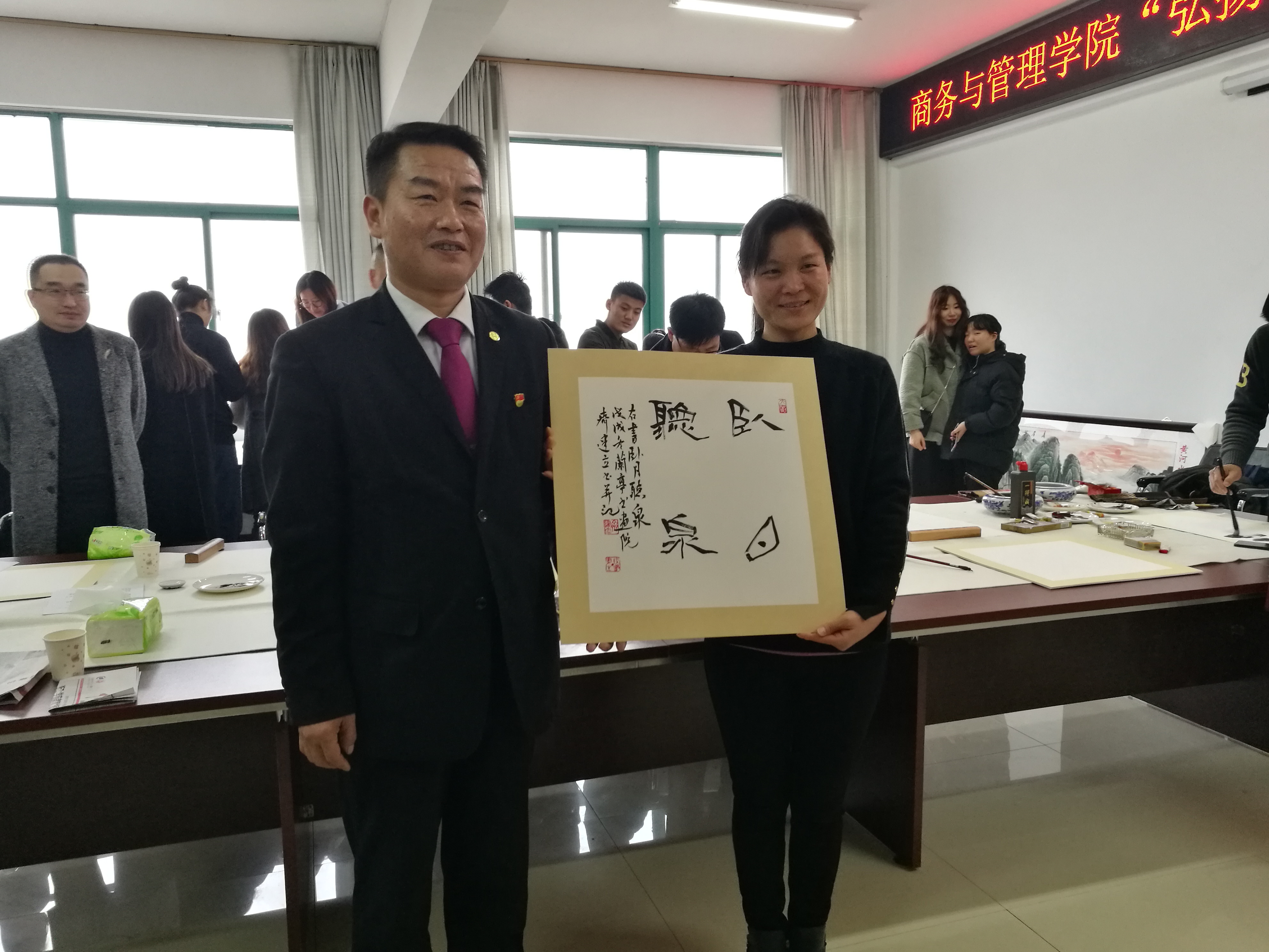 商务与管理学院党总支于12月2日举办了主题为“弘扬中国传统文化 传承书法绘画艺术”的党日活动,兰亭书画院副院长兼秘书长齐建立、副院长赵明月、著名魏碑体书法家李中华、著名瘦金体书法家李国庆、著名画家闻炜应邀出席,商务与管理学院党总支书记樊建科、院长周爱荣及全体教师、学生党员、部分入党积极分子参加了活动。