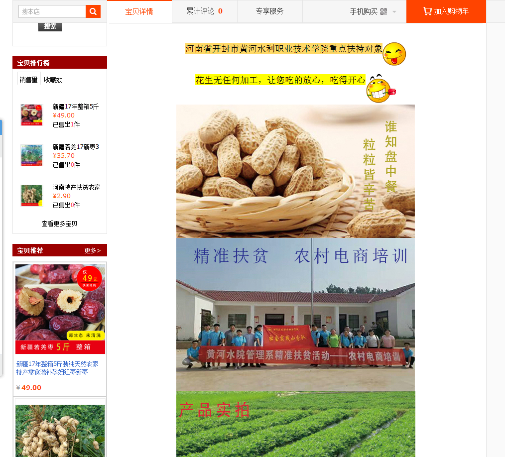 郭景村贫困户郭永宝,因长期患病(糖尿病引起的并发症,脑梗,双眼视力受损),导致贫困,不能干活,家中只能依靠妻子劳动维持日常生活。为解决帮扶对象郭景村郭永宝家生活中的实际困难,管理系采取灵活方式精准扶贫,购买贫困户家储存的花生,同时,结合专业优势,帮助其建立网店进行销售。
